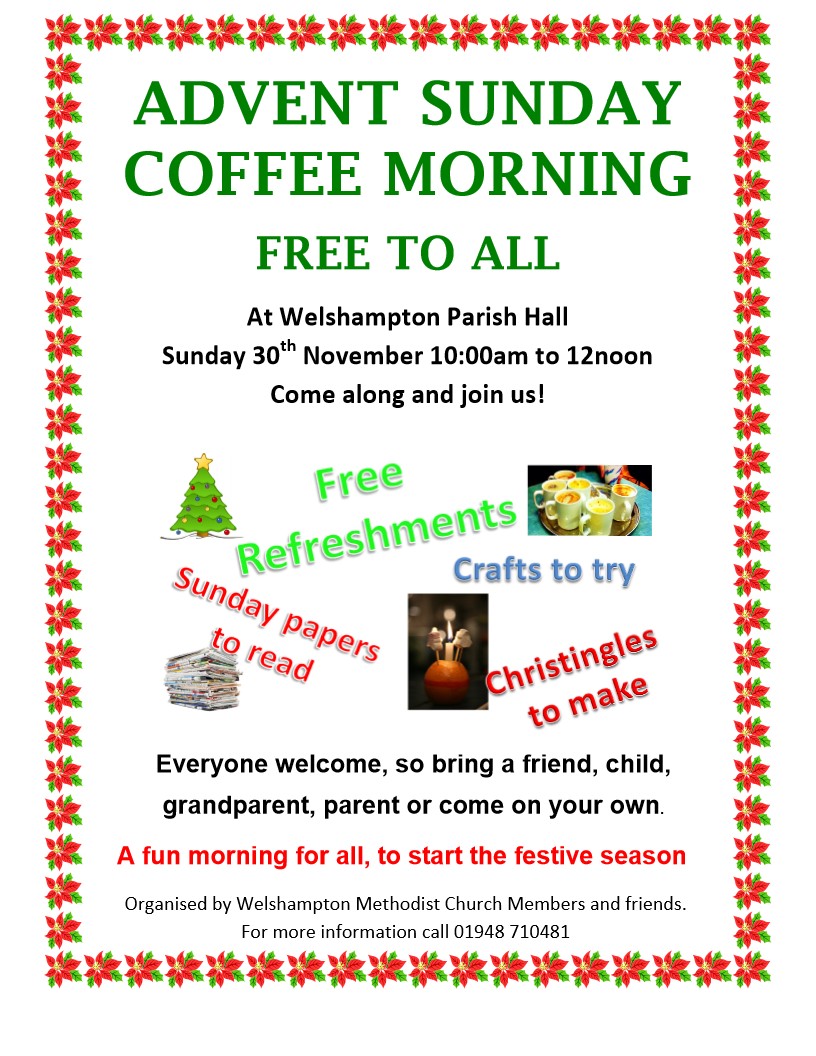 December 30th Advent Sunday Coffee Morning. Free to all.